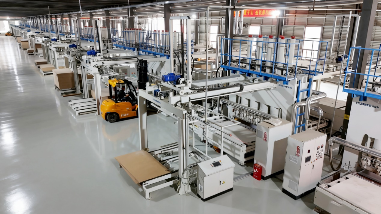 A single workshop houses over twenty PURETE short-cycle press laminating production lines, arranged in a standardized array layout. Daily production schedules are precisely assigned to specific presses, with orders grouped for management to minimize frequent steel plate changes caused by scattered orders. This setup supports a 60% increase in high-end particleboard surface laminating capacity.